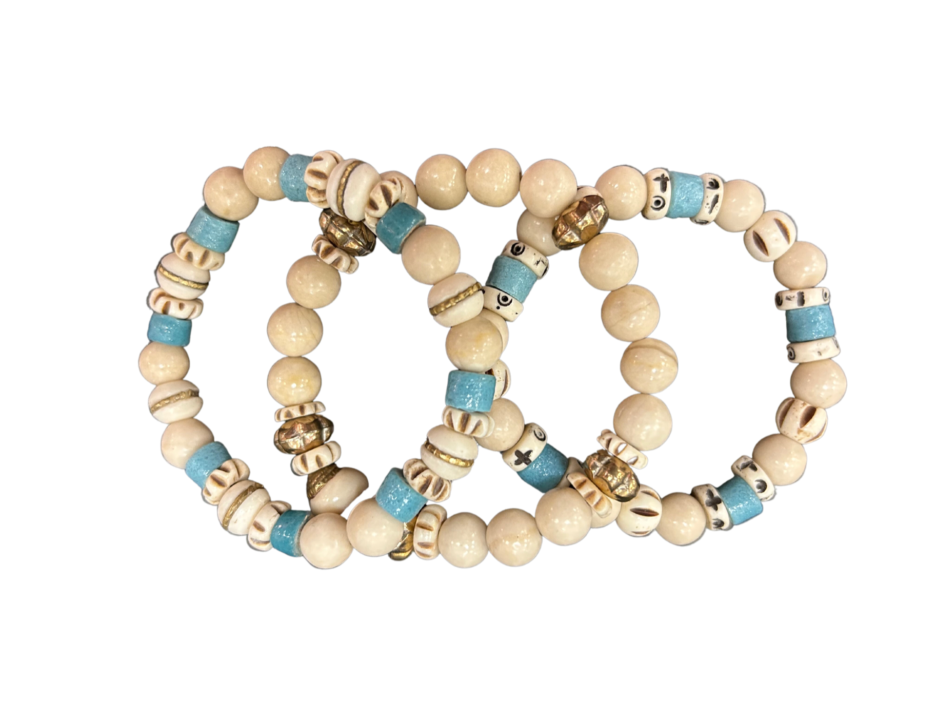- Natural cream Riverstone, natural horn/bone and turquoise blue African glass beads