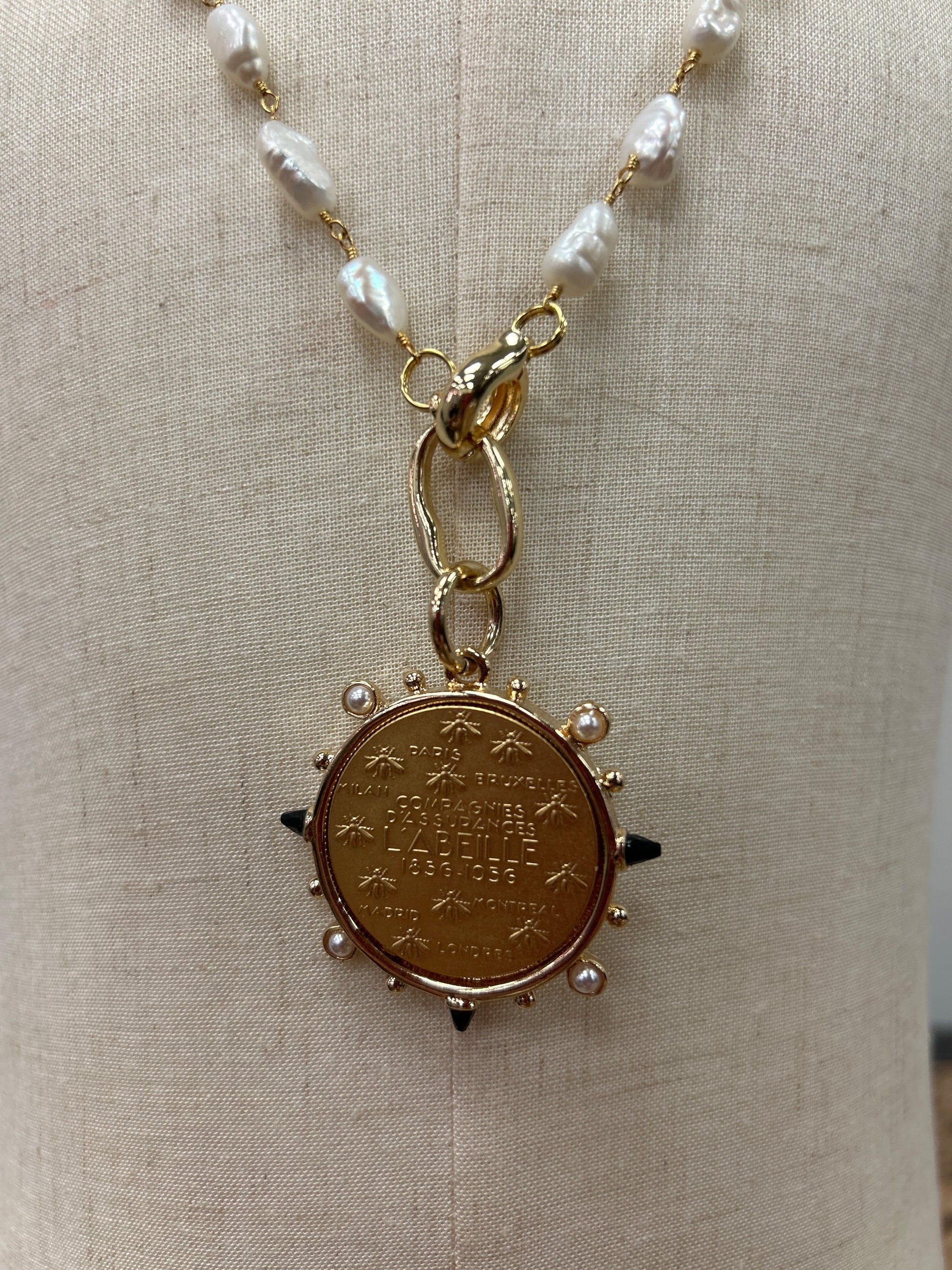 Natural freshwater baroque pearl and gold plated rosary chain featuring a replica French coin made from mixed metals. Gold plated clasp.
